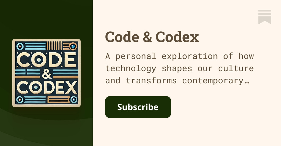 A personal exploration of how technology shapes our culture and transforms contemporary society. Click to read Code & Codex, by Jibone, a Substack ...