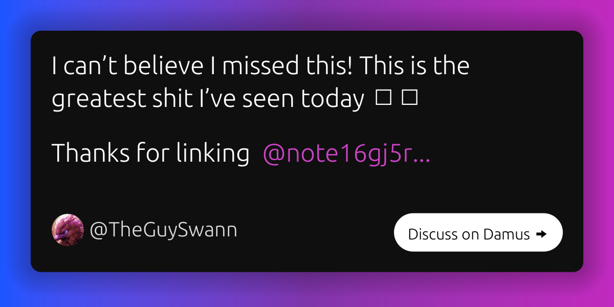 henq 2 years ago DamusTheGuySwann on nostrI can’t believe I missed this! This is the greatest shit I’v Zapple Pay