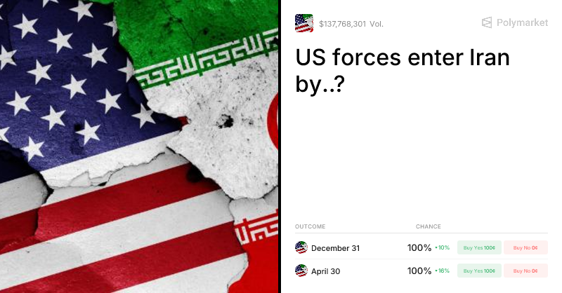 $116,211,380 has traded on "US forces enter Iran by..?" as of April 4, 2026. View real-time odds or trade on The World's Largest Prediction Market™