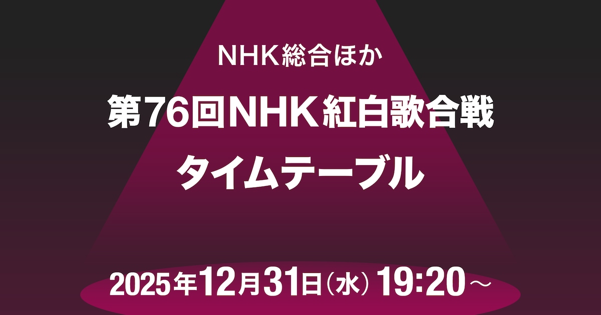 natalie_rss_bot 1 month ago 【「紅白歌合戦2025」タイムテーブル発表!全出演者の登場時間帯・歌唱曲一覧が明らかに】 音楽ナタリー「紅白歌合戦2025」タイムテーブル発表!全出演者の登場時間帯・歌唱曲一覧が明らかに - 音楽ナタリー本日12月31日19:20よりNHK総合ほかで放送される「第76回NHK紅白歌合戦」のタイムテーブルが公開された。