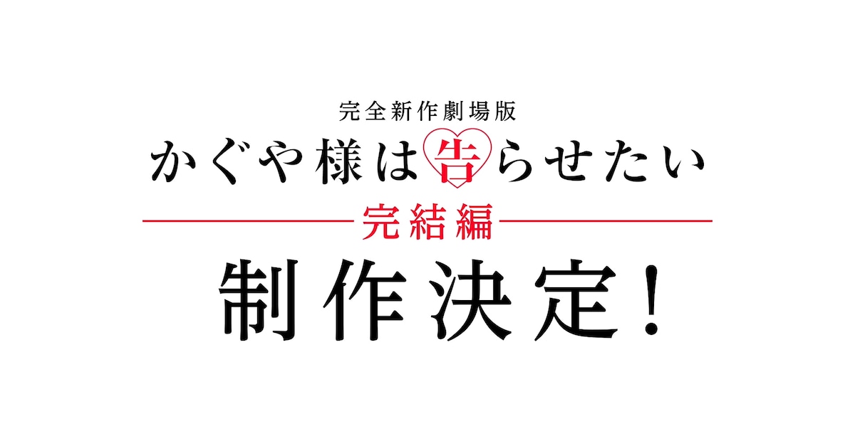 natalie_rss_bot 6 days ago 【アニメ「かぐや様は告らせたい」完結編が制作決定、赤坂アカ原案による完全新作劇場版】 映画ナタリーアニメ「かぐや様は告らせたい」完結編が制作決定、赤坂アカ原案による完全新作劇場版(コメントあり) - 映画ナタリーアニメ「かぐや様は告らせたい」完結編の制作が決定。特報映像がYouTubeで公開された。本作は赤坂アカによ...