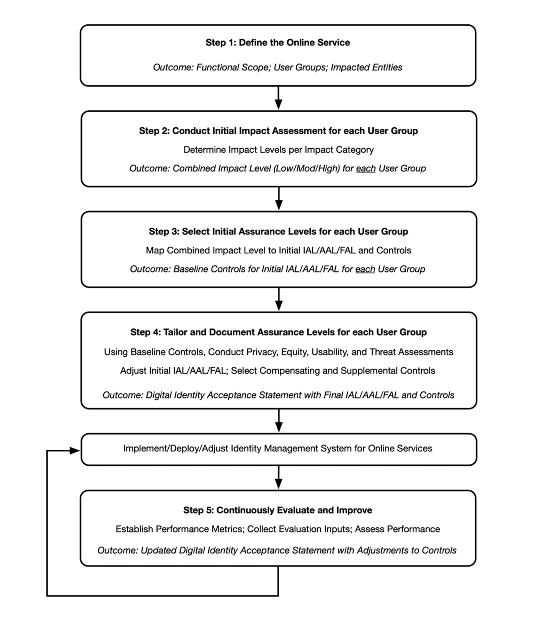 A similar process to define the IAL and FAL as noted in NIST’s Digital Identity Guidelines (NIST SP 800-63-3) is depicted below: