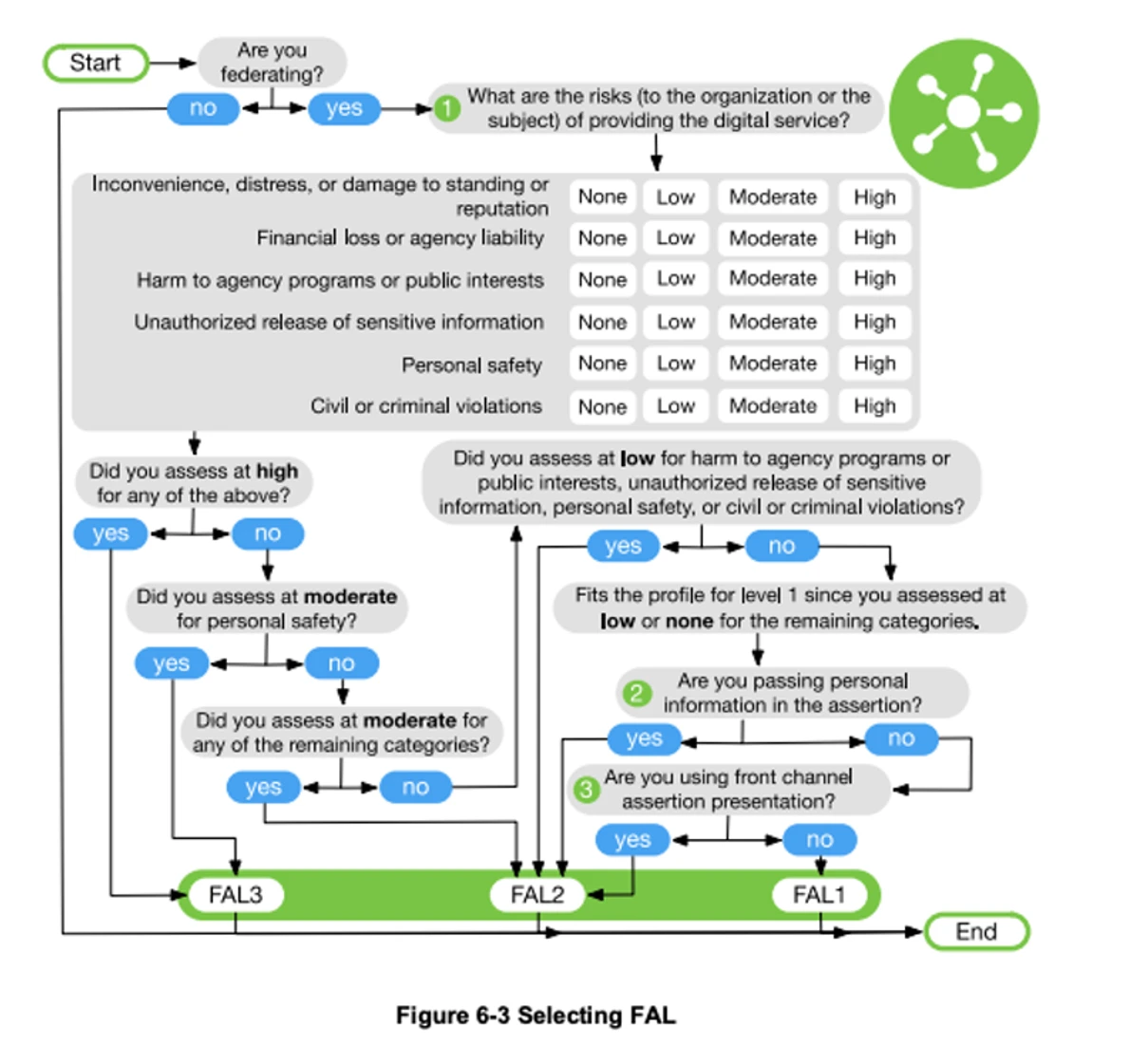 Once the AAL is established, referencing SP 800-63C can be helpful in the next step for selection of the FAL. This assists in identifying the identity federation, which uses the Low, Moderate, and High impact criteria.