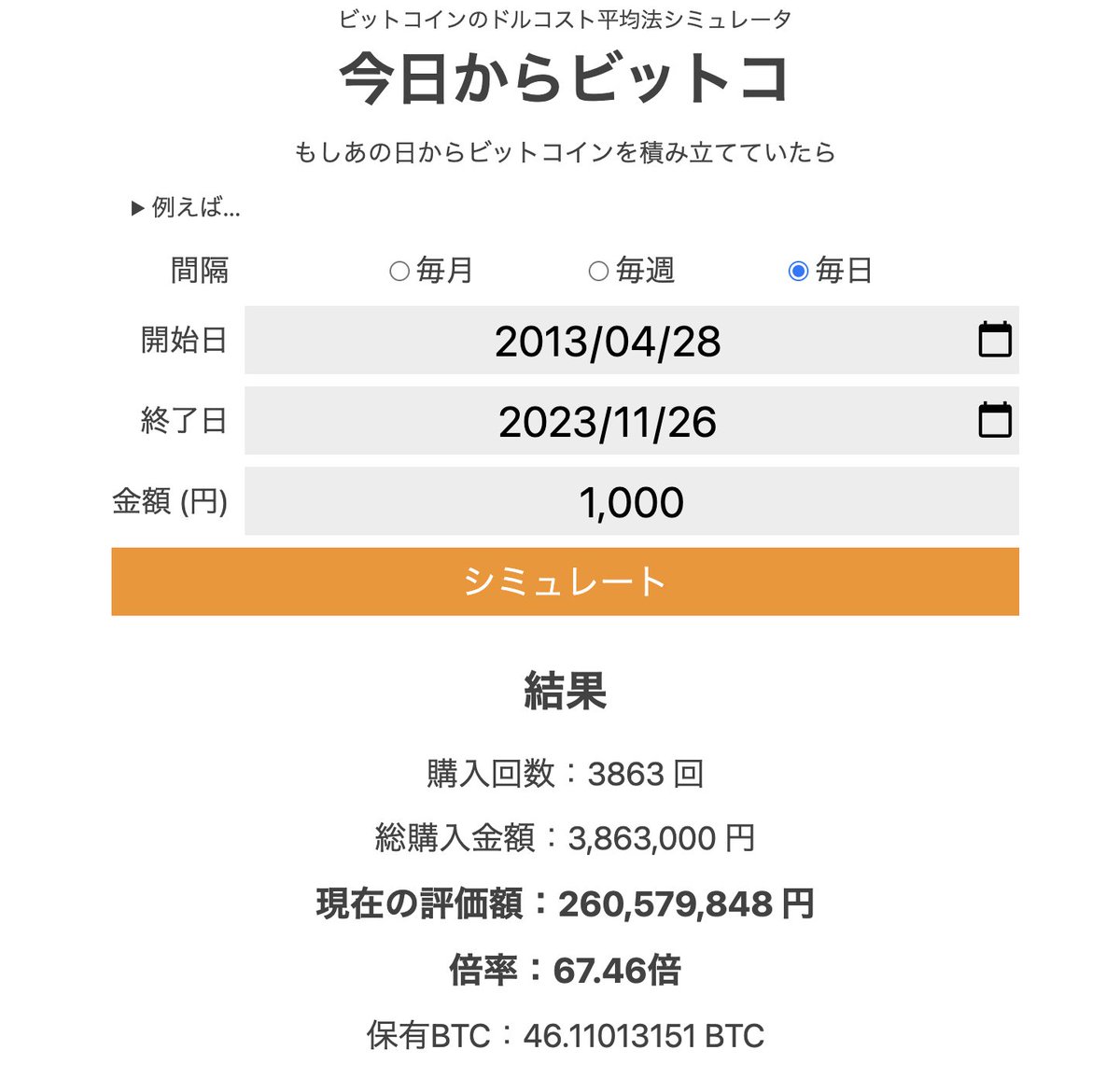 2013/4/28から今日まで毎日1000円ビットコインを買ってた場合、386万円が2億6千万になる。