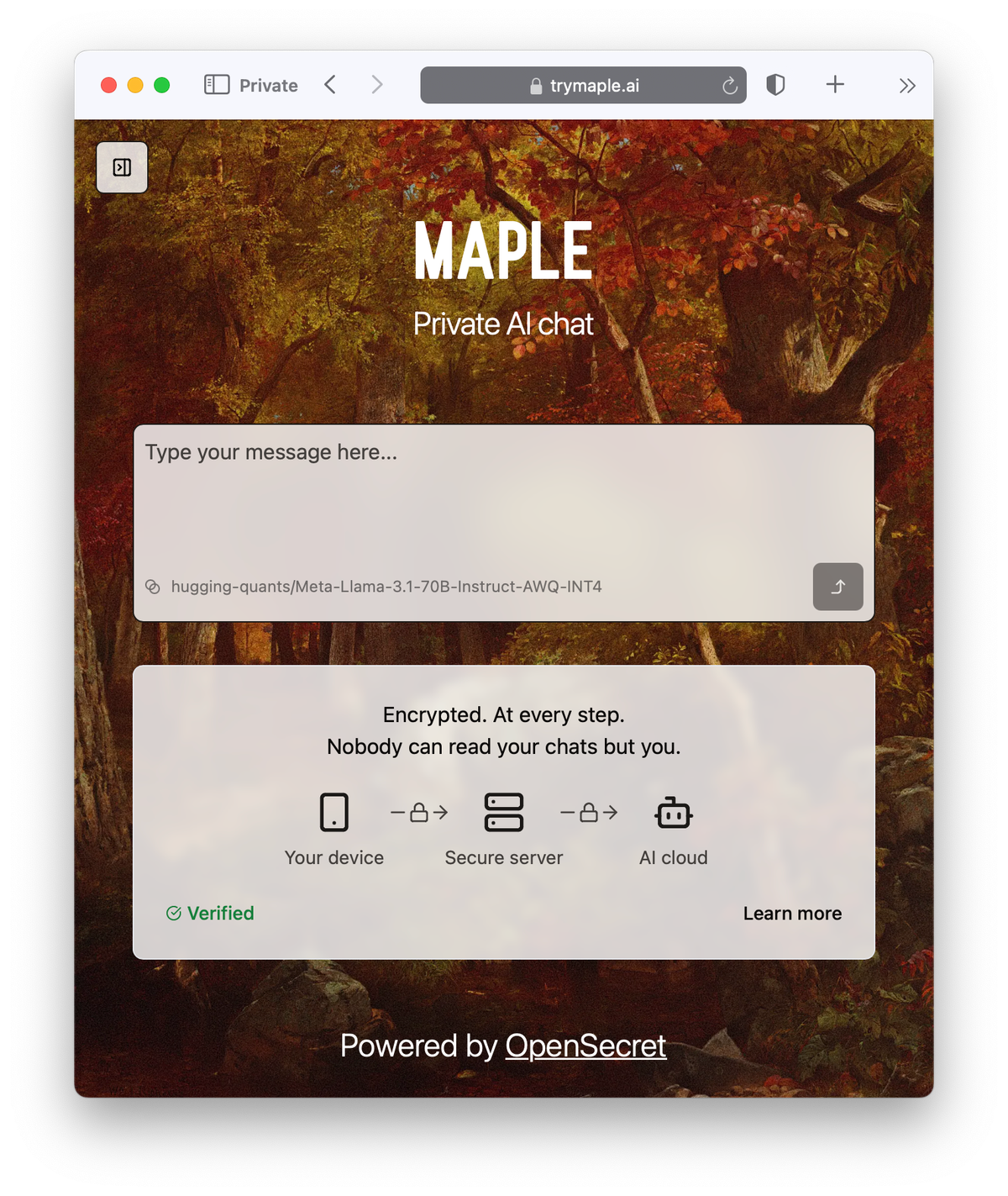 Sign up for Maple AI now and experience the future of secure and private AI. Our open-source technology and end-to-end encryption keep your conversations safe and private, on all your devices. https://trymaple.ai