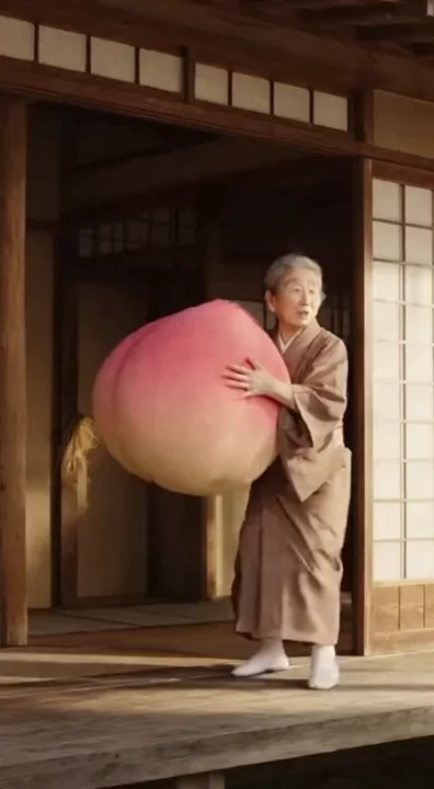 シーン①:場所は日本の昔の家屋、おばあさんが直径80cmくらいはありそうな巨大な桃を抱えて帰宅してきて「...