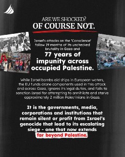 Israel’s attack on an unarmed humanitarian vessel in European waters, and the government silence that followed, is part of a wider pattern: 19 months of Israel's relentless violence in Gaza and 77 years of impunity across occupied Palestine.