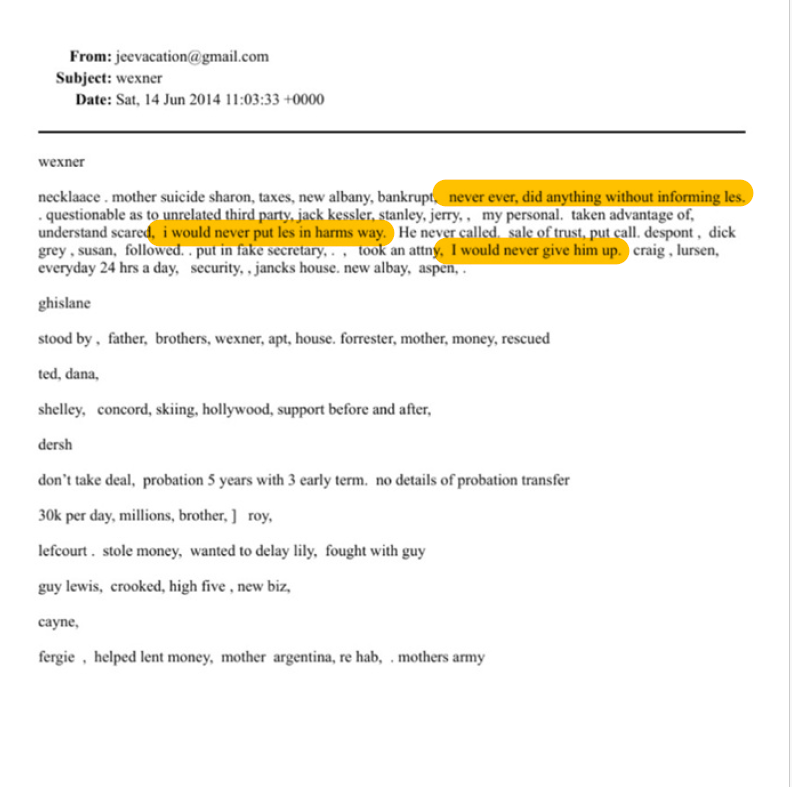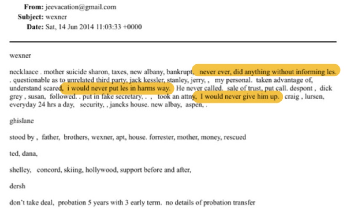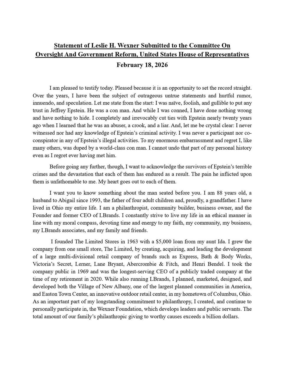 Wexner Says He Was 'Conned' By Epstein, Did 'Nothing Wrong' Wexner Says He Was 'Conned' By Epstein, Did 'Nothing Wrong' After what must have been quite the prep session with lawyers, billionaire Les Wexner - who gave Jeffrey Epstein " " in cash and assets - testified to the House Oversight Committee on Wednesday that he was "conned" by Epstein, and denied any wrongdoing. image In a , the 88-year-old former L Brands (which owned Victoria's Secret) CEO said:  Let me state from the start: I was naïve, foolish, and gullible to put any trust in Jeffrey Epstein. He was a con man. And while I was conned, I have done nothing wrong and have nothing to hide. I completely and irrevocably cut ties with Epstein nearly twenty years ago when I learned that he was an abuser, a crook, and a liar. ... And, let me be crystal clear: I never witnessed nor had any knowledge of Epstein's criminal activity. I was never a participant nor coconspirator in any of Epstein's illegal activities. To my enormous embarrassment and regret, like many others, I was duped by a world-class con man. I cannot undo that part of my personal history even as I regret ever having met him. 350 attorneys charging $2000/hour drafted this. — zerohedge (@zerohedge) Yet many aren't buying it - in 2019, which listed Wexner as a potential co-conspirator.  Meanwhile Epstein in a draft email: "You and I had ‘gang stuff’ for over 15 years," adding "I owe a great debt to you, as frankly you owe to me" and that he had "no intention of divulging any confidence of ours." Also strange: Epstein’s note: “never ever did anything without informing Les [Wexner]”, “would never give him up”. Dershowitz: “don’t take deal”. Made around the time of victims’ discovery requests. Recall that Wexner began funding Epstein in ‘91, same year he founded pro-Israel “Mega Group”. — Good Pyre (@GoodPyre) After launching a business relationship in the 1980s, Wexner and Epstein formed 'a financial and personal bond that baffled longtime associates,' according to the  .  "I think we both possess the skill of seeing patterns," Wexner told Vanity Fair in 2003. "But Jeffrey sees patterns in politics and financial markets, and I see patterns in lifestyle and fashion trends."  image Wexner would go on to open doors for Epstein - who managed "many aspects of his financial life."  By 1995, Epstein was a director of the Wexner Foundation and Wexner Heritage Foundation and president of Wexner’s N.A. Property Inc., which developed the Ohio town of New Albany, where Wexner lives. Epstein also was involved in Wexner’s superyacht, “Limitless,” attending meetings at the London studios of the firm that designed the vessel. - Meanwhile, Epstein allegedly ran a for aspiring Victoria's Secret models out of his Manhattan townhome whereby he would promise young girls jobs with the fashion company.  Epstein "relied on ...[the] modeling business to source underage girls for sex," according to investigative reporter Conchita Sarnoff's new book "Trafficking."  image According to an account by Italian model Elisabetta Tai, Epstein tried to take advantage of the 21-year-old aspiring Victoria's Secret model in 2004 after she was promised that a meeting with a 'very important' man could land her a gig with the apparel company.  Accuser Holds Wexner Responsible In late 2019, a woman who says Jeffrey Epstein and his 'madam' Gislaine Maxwell sexually assaulted her holds Victoria's Secret billionaire Leslie Wexner "responsible for what happened to me," because she was staying on a property monitored by Wexner and his wife, and guarded by their security team, according to the https://www.washingtonpost.com/business/economy/epstein-accuser-holds-victorias-secret-billionaire-responsible-as-he-keeps-his-distance/2019/10/05/1b6baf6c-d0d3-11e9-b29b-a528dc82154a_story.html .  Maria Farmer, now in her mid-50s, spoke with the Post in a series of interviews, telling the paper that she never met Leslie, and only spoke with Abigail via phone while at the property in New Albany, Ohio.  In the summer of 1996, Farmer stayed at the country house that Wexner had deeded to Epstein four years earlier. While staying staying there, she was discouraged from going outside by Wexner's security, and that she was forced to jog inside the 10,600 square-foot house.  "Where I stayed that summer, in that house and working in that garage, all of it was within view of the Wexner house," said Farmer.  The house, although owned by Epstein at the time, was “effectively the guesthouse” for the main Wexner estate, and it was guarded only by Wexner personnel, according to a security officer involved with Wexner family security at the time, who spoke on the condition of anonymity because he did not want to discuss clients publicly. The two homes are a half-mile apart. The grounds were monitored closely by guard dogs and their armed minders, this officer said. It was surrounded by Wexner’s land, according to property records. “Anybody that was going to be coming on property had to be announced and allowed in by the Wexners,” added the officer. “Nobody had carte blanche to go in and off the property.” ... Farmer, then 26, had just been invited to create two large-scale paintings for the upcoming film “As Good As It Gets,” starring Jack Nicholson. Epstein offered Farmer an unexpected location to do the work in the summer of 1996: an expansive country home in New Albany, Ohio, located amid 336 acres of land owned by Wexner and guarded in part by sheriff’s deputies employed by the longtime chief executive of Victoria’s Secret and The Limited. It was there, Farmer said in an https://www.washingtonpost.com/context/maria-farmer-affidavit/34faddfa-7d8d-466b-a082-b925b5528a69/?tid=lk_inline_manual_4 "They asked me to come into a bedroom with them and then proceeded to sexually assault me against my will," said Farmer in her https://www.washingtonpost.com/context