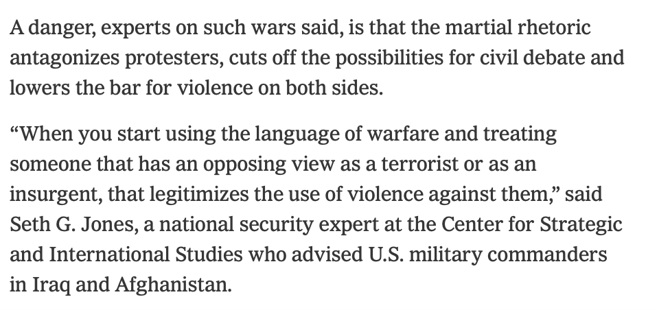 Calling anti-ICE riots an "insurrection" or "insurgency... poses dangers," says @nytimes. It "legitimizes the use of violence," says a CSIS expert.