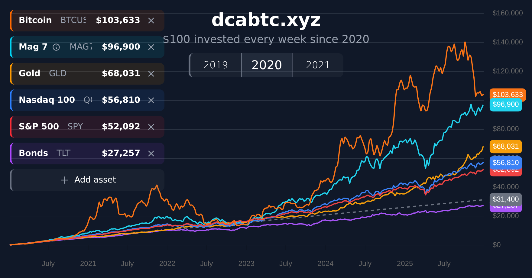 Compare Bitcoin Dollar Cost Averaging (DCA) performance against S&P 500, Nasdaq 100, Gold, and Bonds. See how $100 weekly investments perform over ...