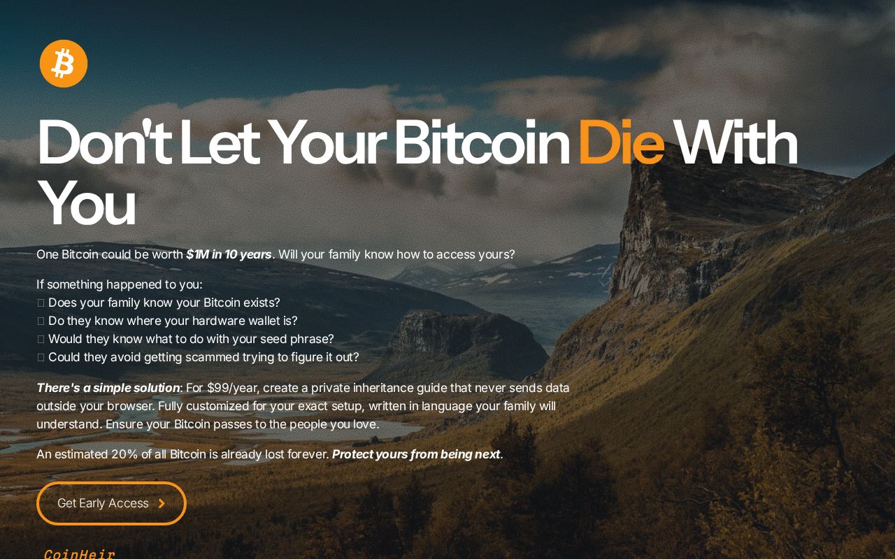 Don't let your Bitcoin die with you. CoinHeir helps you create a step-by-step inheritance guide so your family can safely access your bitcoin ...