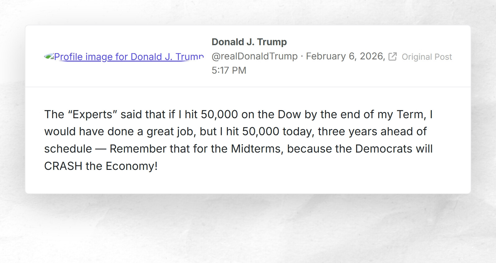 The “Experts” said that if I hit 50,000 on the Dow by the end of my Term, I would have done a great job, but I hit 50,000 today, three years ahead of schedule — Remember that for the Midterms, because the Democrats will CRASH the Economy! The “Experts” said that if I hit 50,000 on the Dow by the end of my Term, I would have done a great job, but I hit 50,000 today, three years ahead of schedule — Remember that for the Midterms, because the Democrats will CRASH the Economy!