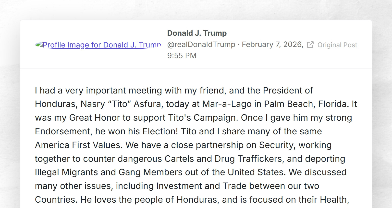 I had a very important meeting with my friend, and the President of Honduras, Nasry “Tito” Asfura, today at Mar-a-Lago in Palm Beach, Florida. It was my Great Honor to support Tito's Campaign. Once I gave him my strongEndorsement, he won his Election! Tito and I share many of the same America First Values. We have a close partnership on Security, working together to counter dangerous Cartels and Drug Traffickers, and deporting Illegal Migrants and Gang Members out of the United States. We discussed many other issues, including Investment and Trade between our two Countries. He loves the people of Honduras, and is focused on their Health, Well-being, Education, and Economic Prosperity. I look forward to welcoming President Asfura back to the United States. Tito: Congratulations on your Great Victory! PRESIDENT DONALD J. TRUMP I had a very important meeting with my friend, and the President of Honduras, Nasry “Tito” Asfura, today at Mar-a-Lago in Palm Beach, Florida. It was my Great Honor to support Tito's Campaign. Once I gave him my strongEndorsement, he won his Election! Tito and I share many of the same America First Values. We have a close partnership on Security, working together to counter dangerous Cartels and Drug Traffickers, and deporting Illegal Migrants and Gang Members out of the United States. We discussed many other issues, including Investment and Trade between our two Countries. He loves the people of Honduras, and is focused on their Health, Well-being, Education, and Economic Prosperity. I look forward to welcoming President Asfura back to the United States. Tito: Congratulations on your Great Victory! PRESIDENT DONALD J. TRUMP