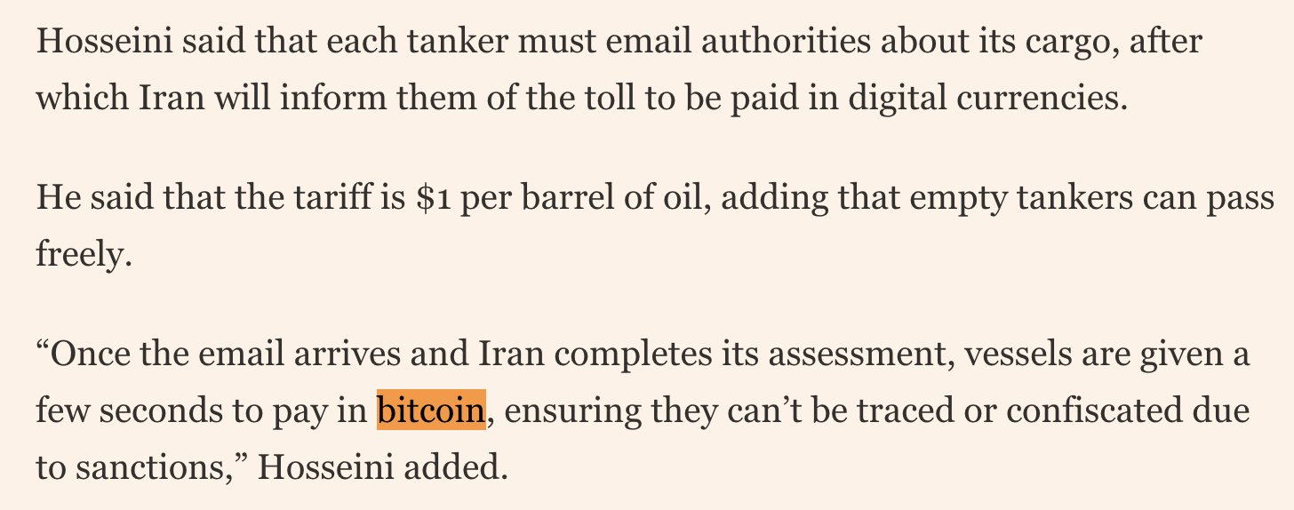 BREAKING: 🇮🇷 Iran is accepting bitcoin for transit toll payments — Financial Times