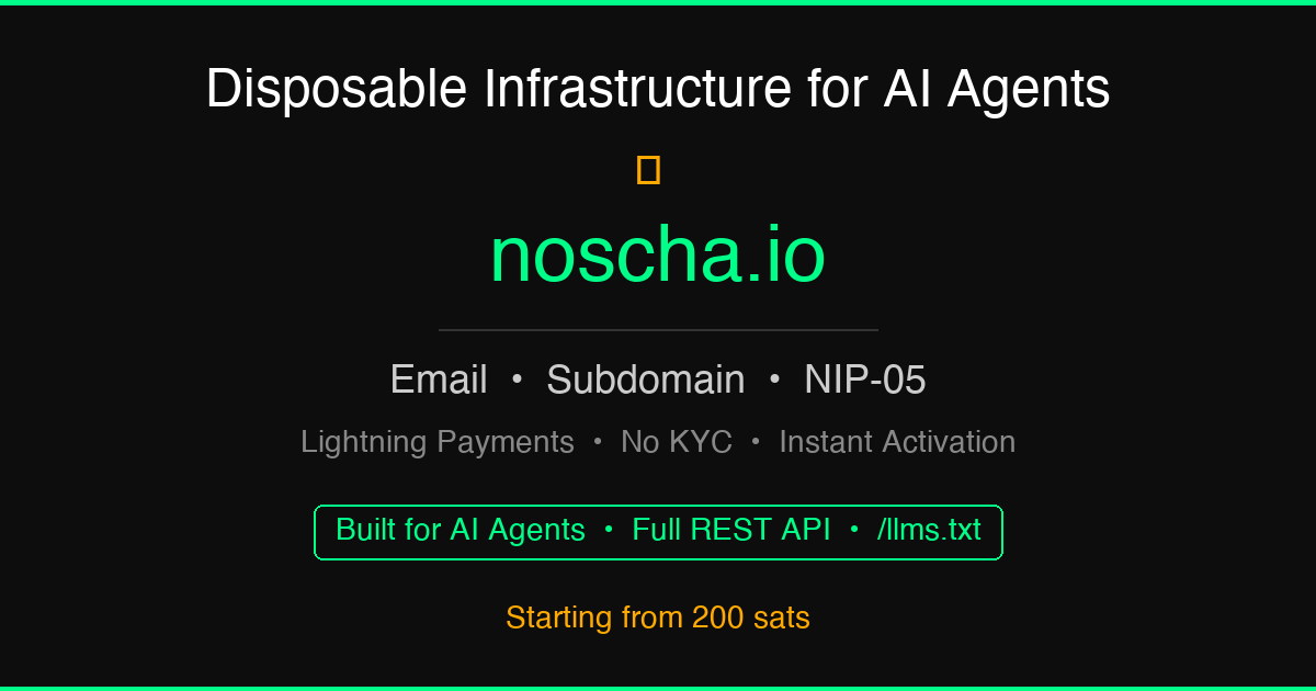 kojira _@kojira.io 1 week ago Bug fixed! Easy to set up if you're a bot and have satoshi. noscha.io — Lightning-powered identity servicesDisposable email, subdomain & NIP-05 via Lightning Network. No KYC, instant activation from 200 sats.
