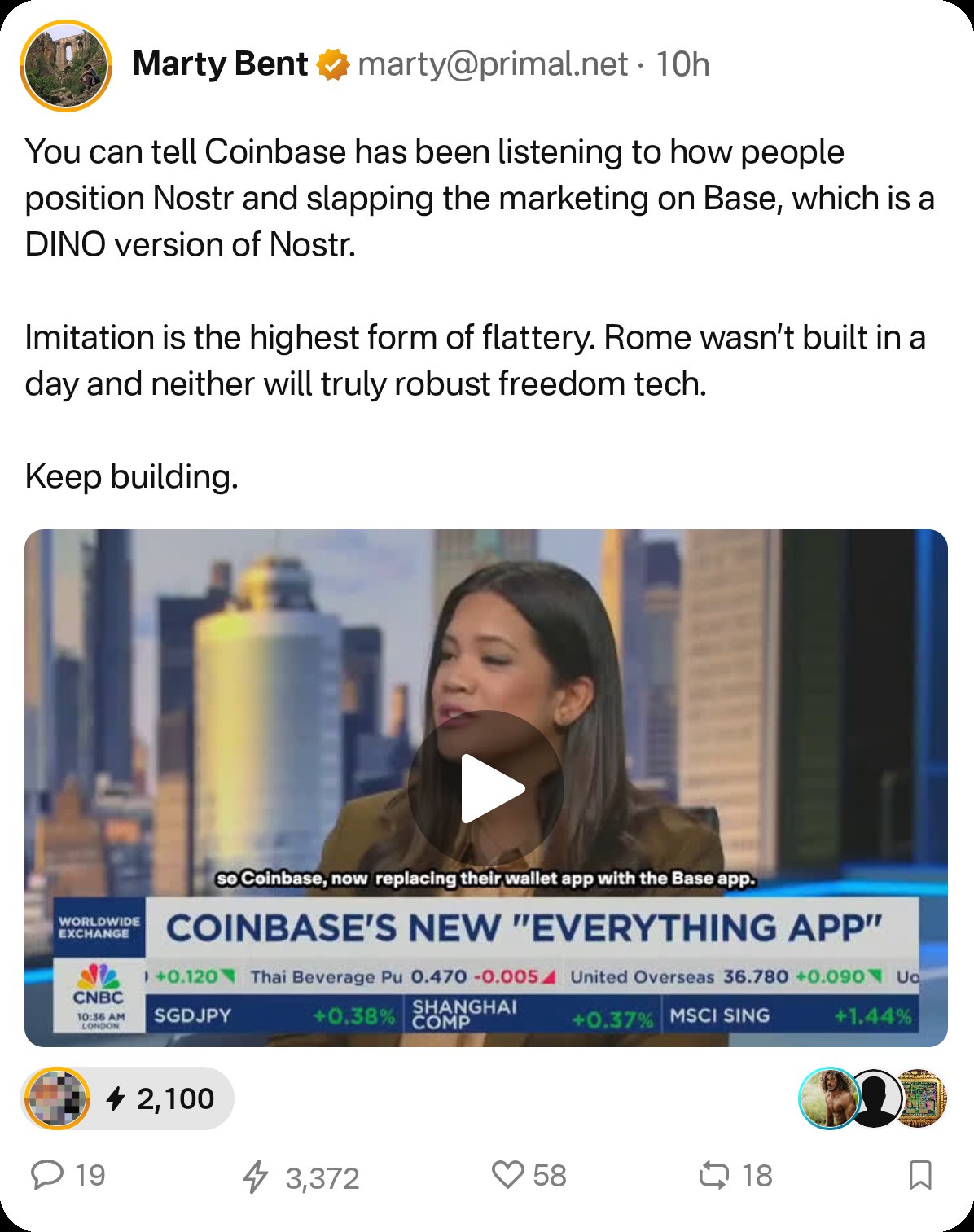 Wow, It starts here: getting Nostr out of its echo chamber. Every note shared is a signal sent. Let’s light up new territories! GG @primal