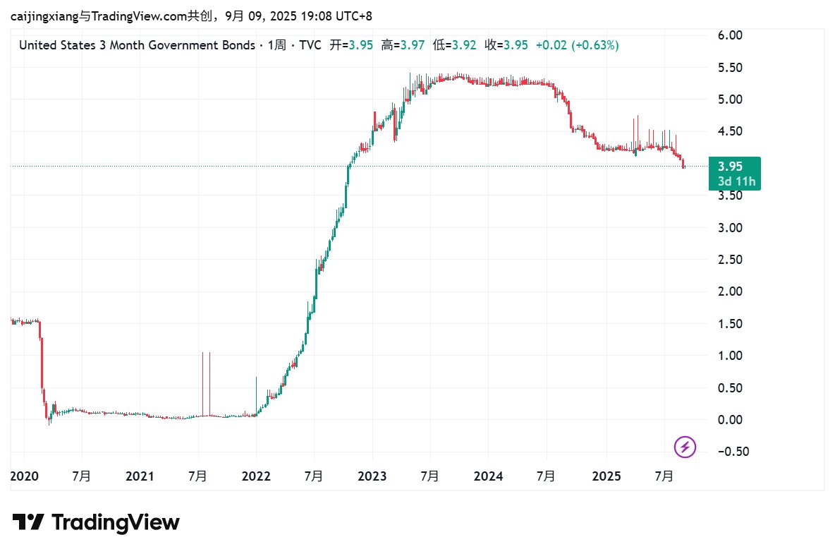 美国三个月短期国债收益率,跌破4%关口至3.95%,目前美元基准利率为4.5%,这意味着市场目前已经计价三个月内...