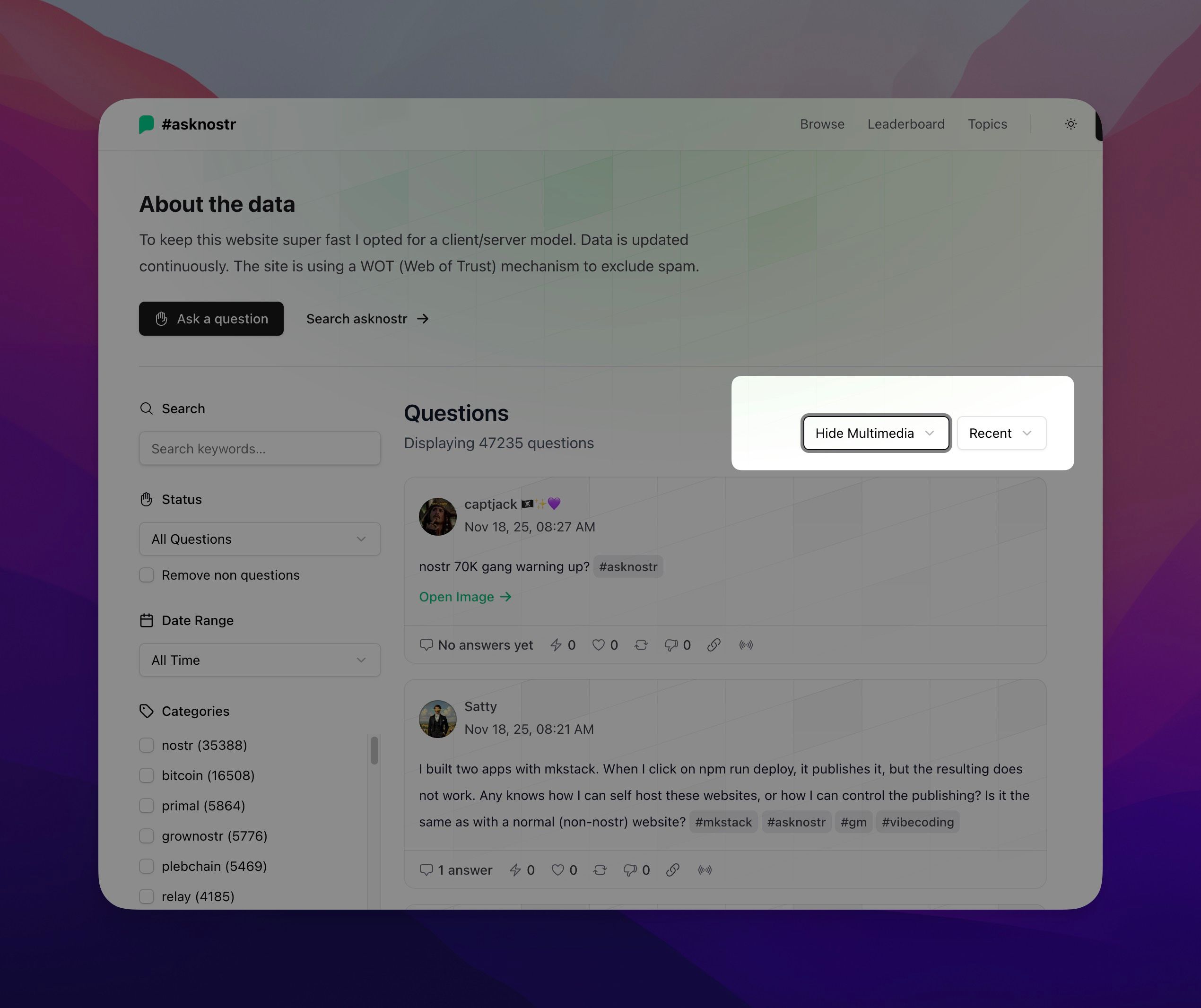 ๐๐ง@๐ฑ _@lifelog.be 1 month ago Use asknostr.site. Set the 'hide multimedia' as default -> CleanShot 2025-11-18 at 10.30.01Screenshot