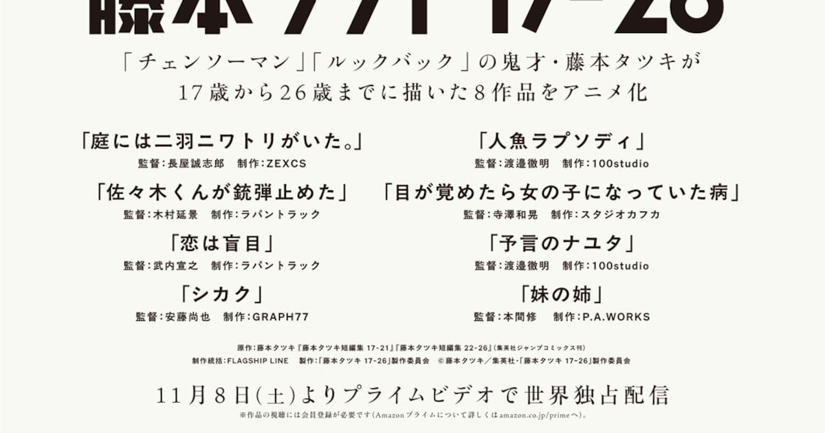 ナタリー RSS BOT 【非公式】 7 months ago 【藤本タツキの短編集「17-21」「22-26」がアニメ化、11月8日からPrime Videoで独占配信】 コミックナタリー藤本タツキの短編集「17-21」「22-26」がアニメ化、11月8日からPrime Videoで独占配信(動画あり / コメントあり) - コミックナタリー藤本タツキの短編集「藤本タツキ短編集 17-21」「藤本タツキ短編集 22-26」に収められた短編8作品がアニメ化...