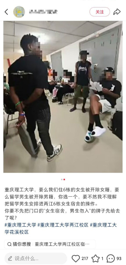 网友投稿:重庆理工大学安排男黑人留学生入住女生宿舍,引发同楼女生强烈不满,并在网络上发起抗议。事件...